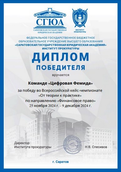 10 декабря 2024 года подведены итоги Всероссийского научного кейс-чемпионата «От теории к практике», организованного Институтом прокуратуры Саратовской государственной юридической академии.