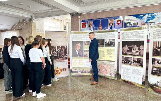 22 апреля 2025 года старшим преподавателем кафедры государственно-правовых дисциплин Крымского юридического института (филиала) Университета прокуратуры Российской Федерации Анкудиновой Яной Станиславовной и студентом 2 курса Ериным Яном была проведена экскурсия по выставке «Ялтинская конференция 4–11 февраля 1945 г. Система послевоенного мироустройства» для учащихся СОШ № 26 им. М.Т. Калашникова.