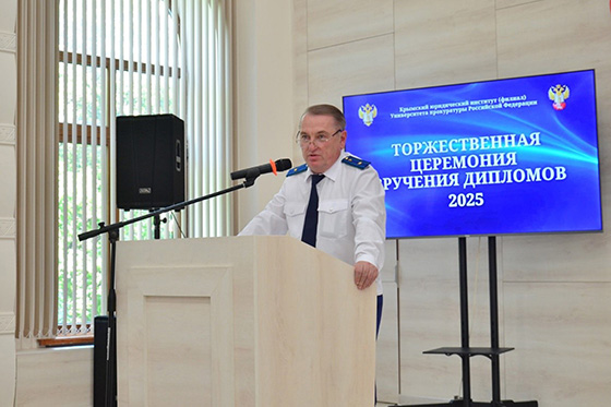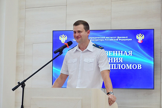 С поздравительной речью к выпускникам обратился и.о. прокурора Республики Крым Д.А. Егоров. Он поздравил выпускников с окончанием учебы, отметив, что именно из Университета и его филиалов в органы прокуратуры приходят работать уже готовые специалисты. Также Дмитрий Андреевич дал советы выпускникам, которые пригодятся им на профессиональном пути.