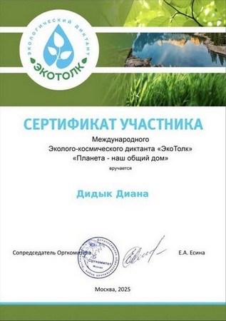 С 6 по 7 октября 2025 года студенты 3 и 4 курсов Крымского юридического института (филиала) Университета прокуратуры Российской Федерации совместно со старшим преподавателем кафедры государственно-правовых дисциплин Анкудиновой Я.С. приняли участие в ежегодной международной просветительской акции «Международный экологический диктант «ЭкоТолк»», организованном Ассоциацией граждан по содействию развития экологического образования и просвещения «ЭкоТолк» при поддержке Комитета Государственной Думы по экологии, природным ресурсам и охране окружающей среды.