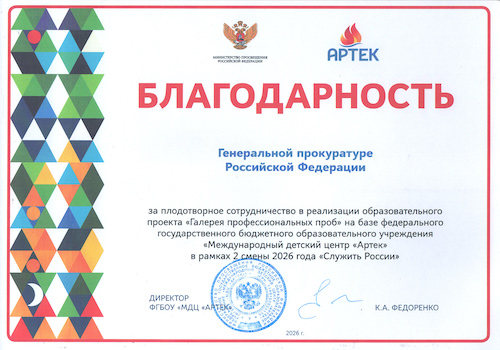 По результатам проведенного мероприятия была вручена благодарность от директора МДЦ «Артек» Федоренко К.А. в адрес Генеральной прокуратуры Российской Федерации за плодотворное сотрудничество в реализации образовательного проекта «Галерея профессиональных проб», а также именные благодарности работникам и студентам Института.