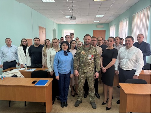 В ходе общения со слушателями Дмитрий Александрович рассказал о том, как в 2022 году после начала специальной военной операции принял решение пойти добровольцем, как выполнял боевые задачи, о своем фронтовом пути и солдатском подвиге, боевых товарищах и тяготах воинской службы. Дмитрий Александрович по возвращении со службы стал заниматься общественно-полезной деятельностью, поведал о работе Государственного фонда «Защитники отечества» по Республике Крым, о взаимодействии Фонда с органами прокуратуры в вопросах восстановления и защиты прав участников СВО и членов их семей, донес до слушателей и общественно-политические аспекты такой деятельности.