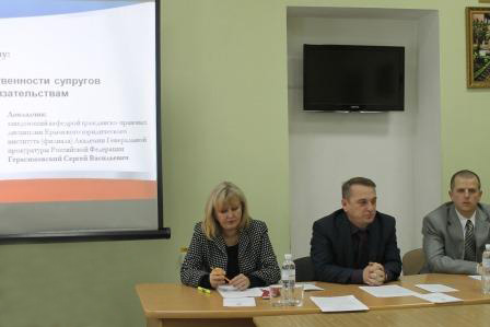 заведующий кафедрой гражданско-правовых дисциплин, кандидат юридических наук Герасимовский С.В., доклад на тему: «Актуальные вопросы ответственности супругов по имущественным обязательствам»;