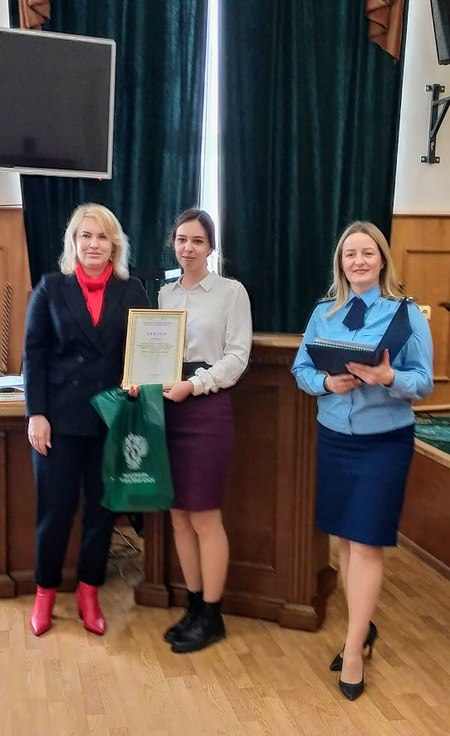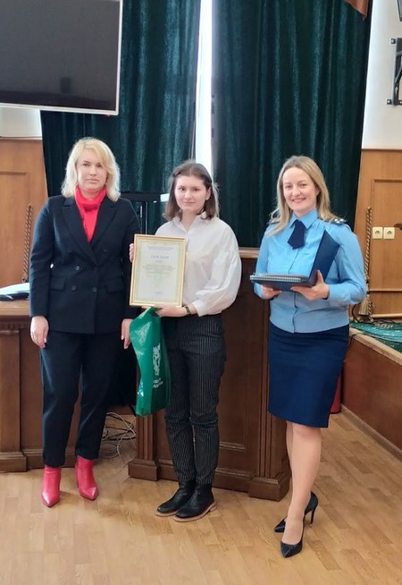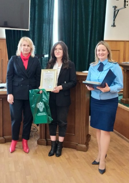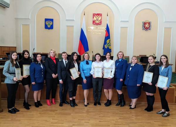 Награждение победителей конкурса в торжественной обстановке в прокуратуре Республики Крым проводили: начальник отдела кадров прокуратуры Республики Крым Шаврина Е.В. и старший помощник прокурора Республики Крым по взаимодействию с законодательными (представительными) и исполнительными органами власти, органами местного самоуправления Серебрякова Т.А. По результатам конкурса студенты Института завоевали следующие места: 1 место – студент 4 курса Новикова М.С. с проектом Федерального закона «О внесении изменений и дополнений в Трудовой кодекс Российской Федерации в части закрепления дефиниции «трудовых отношений» (научный руководитель – доцент кафедры гражданско-правовых дисциплин Института Заулочная С.А.);