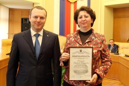 Остапчук Людмиле Леонидовне начальнику отдела планирования, труда, финансирования, бухгалтерского учета и отчетности вручена благодарность от председателя Государственного Совета Республики Крым Константинова В.А. и Меньшовой Анне Петровне старшему лаборанту кафедры общегуманитарных и социально-экономических дисциплин ценный подарок.