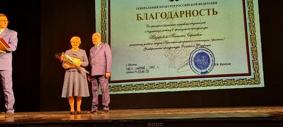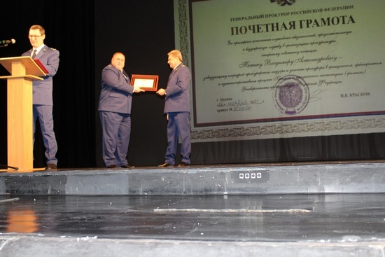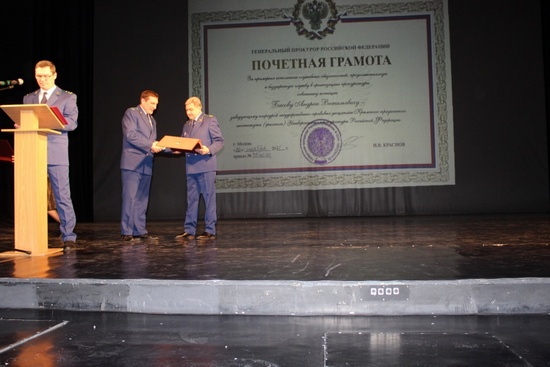 Почетную грамоту Генерального прокурора Российской Федерации получили заведующий кафедрой государственно-правовых дисциплин Басов А.В., заведующей кафедрой прокурорского надзора и участия прокурора в гражданском, арбитражном и административном процессе Тюнин В.А., Благодарность Генерального прокурора Российской Федерации - начальник учебного отдела Назарова Т.С.