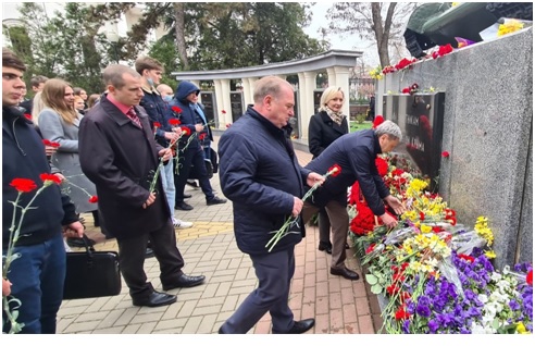 Возложение цветов заместителем директора С.В. Герасимовским к мемориальной доске, посвященной актерам-подпольщикам